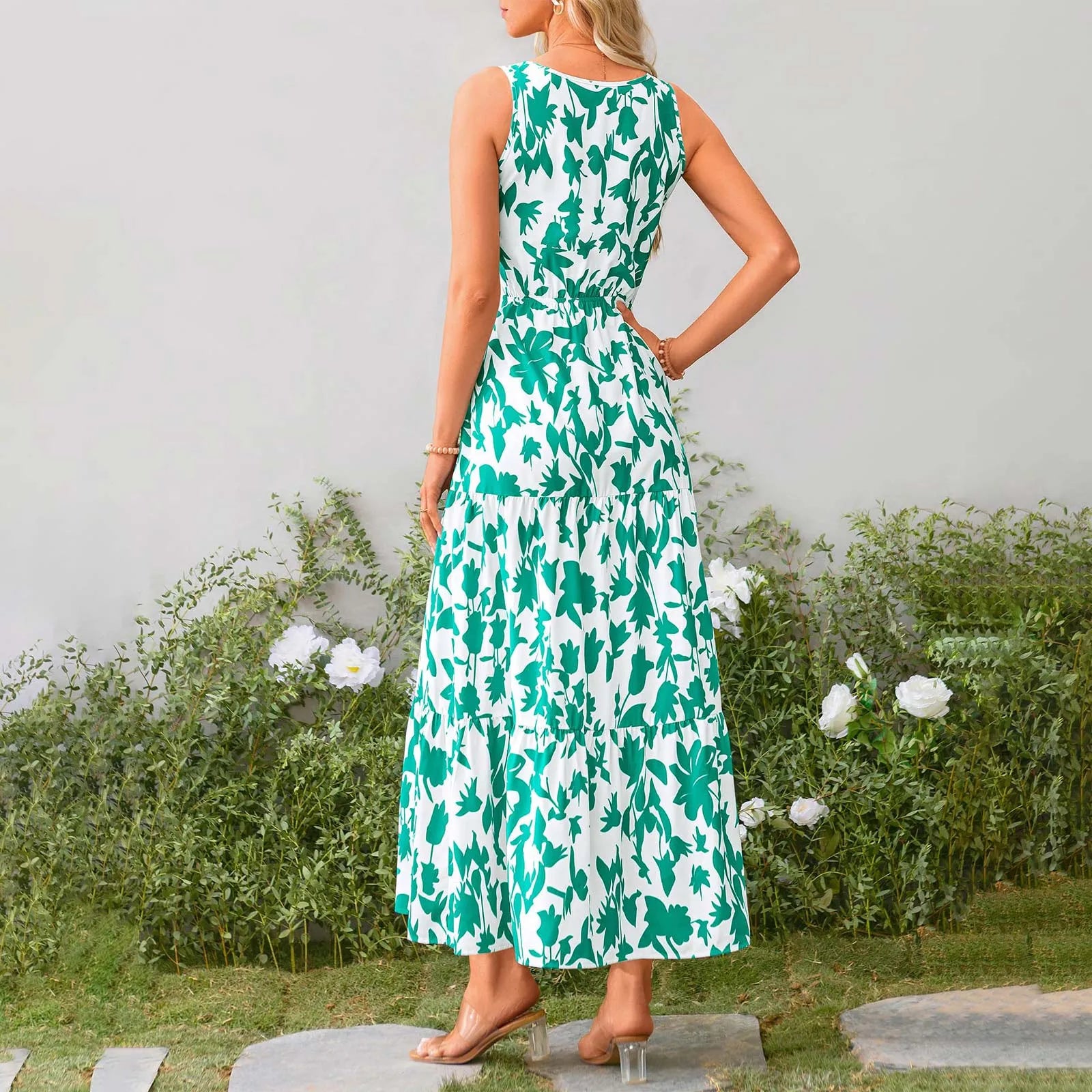 A flowing maxi dress with tiered ruffles and a soft print, blending boho charm with refined summer elegance.